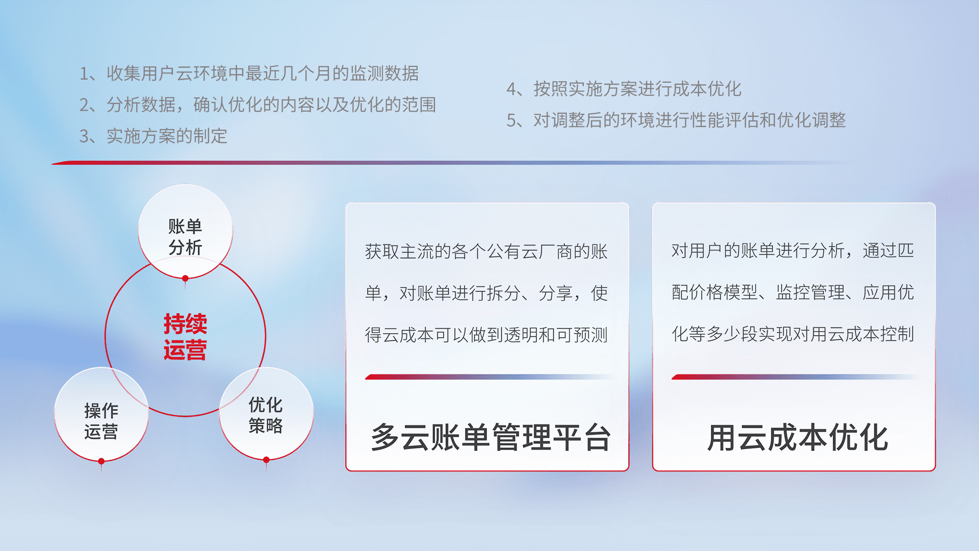 通过多云纳管,,,以统一的资源数据模型把客户的云资源进行抽象和封装,,进而实现对多云资源的统一操作,,,,保障云资源管理的可靠性、、、稳定性与可用性。。。。量身定制化运维内容,,,,配置、、、、开发运维、、、补丁管理、、、备份、、、监控、、认证和访问管理、、、、审计和日常巡检等,,,,保障在用云过程中的可靠度,,,稳定度以及高可用率。。。