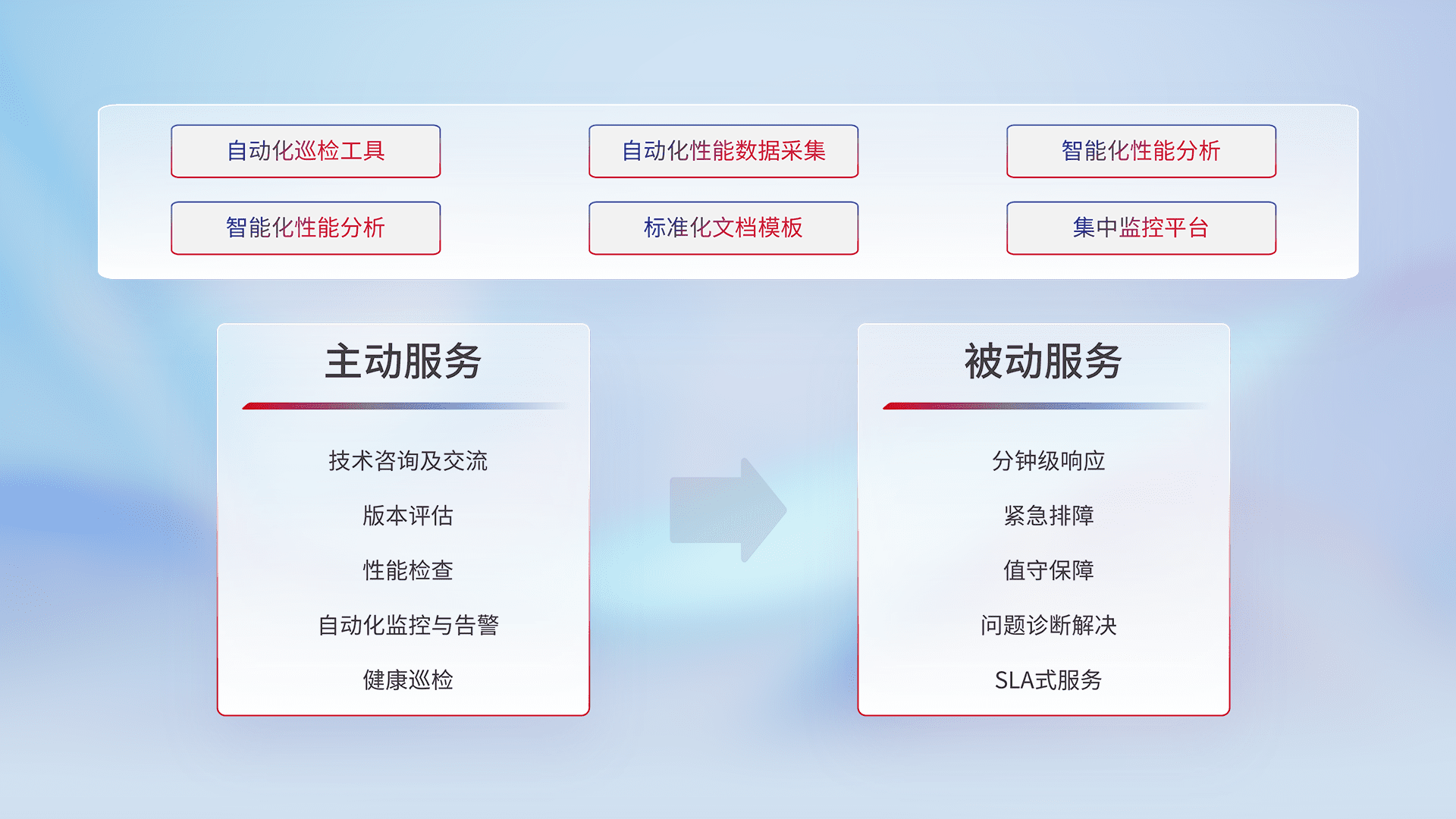 智能化工具和标准化文档,,,,保障服务质量,,,提供主动服务(包含技术咨询、、、、版本评估、、、、性能检查、、、自动化监控与告警、、、、健康巡检)和被动服务包含(分钟级响应、、、、紧急排障、、、值守保障、、、问题诊断解决、、、、SLA服务)。。。